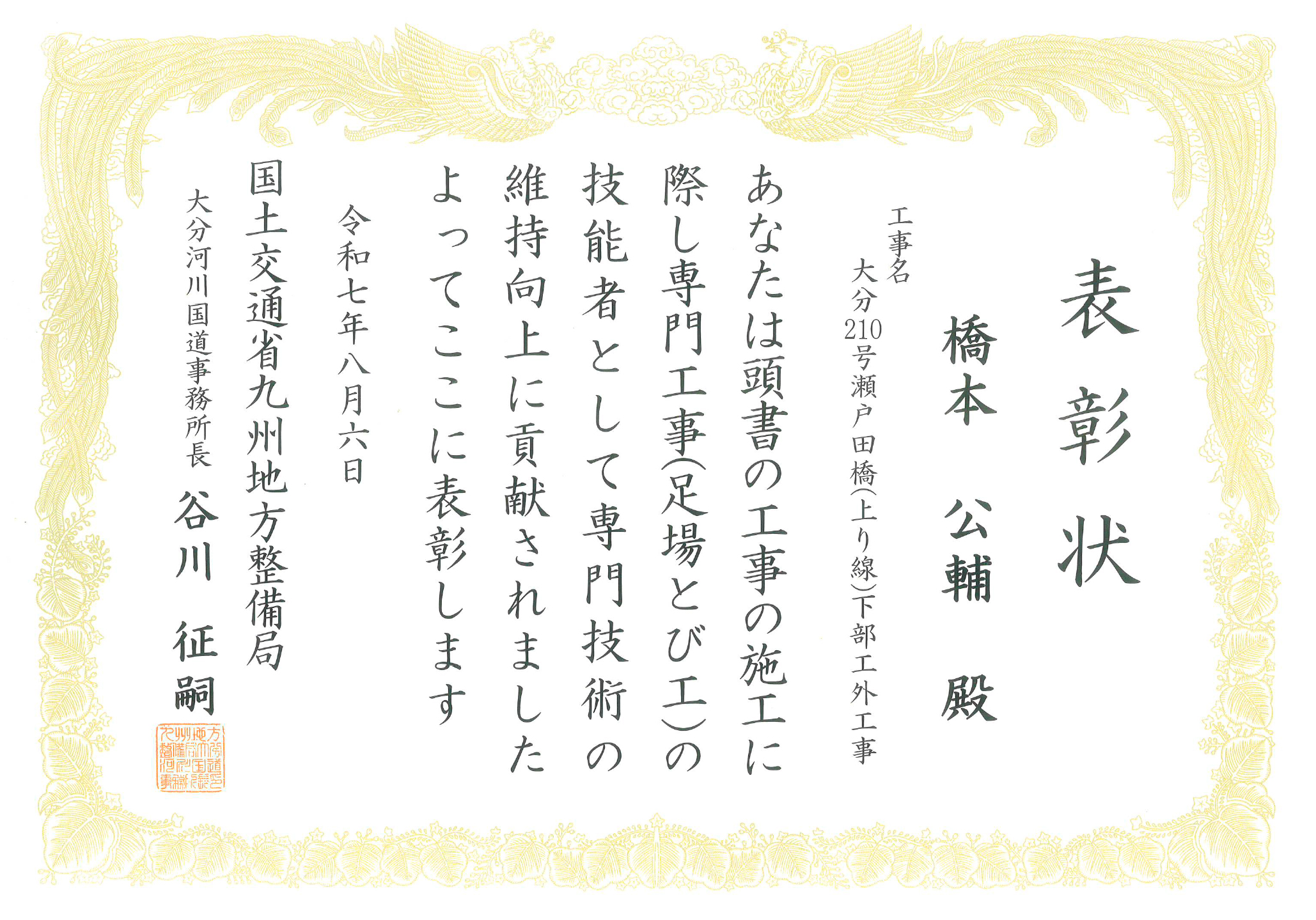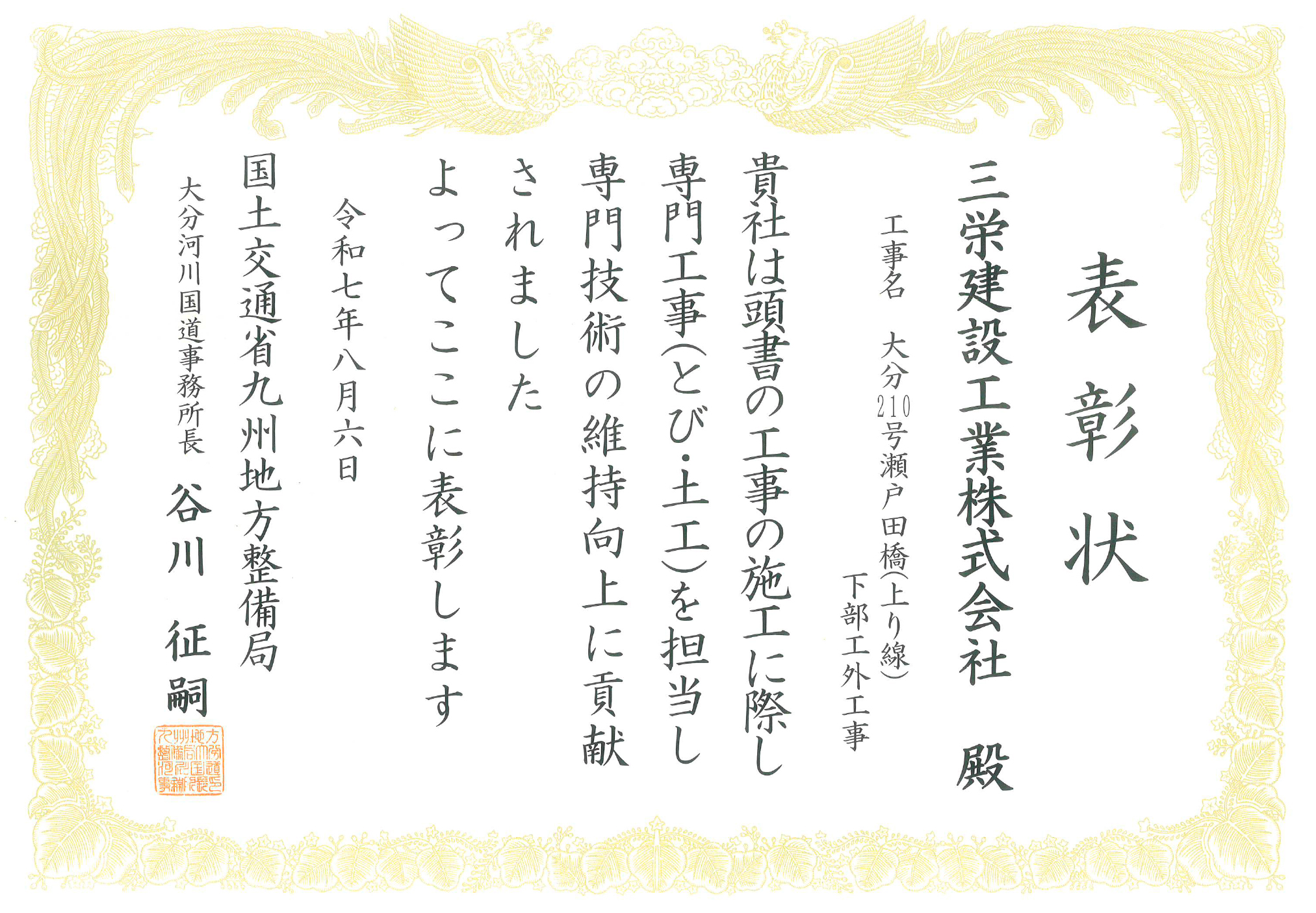 国土交通省九州地方整備局 大分河川国道事務所長表彰